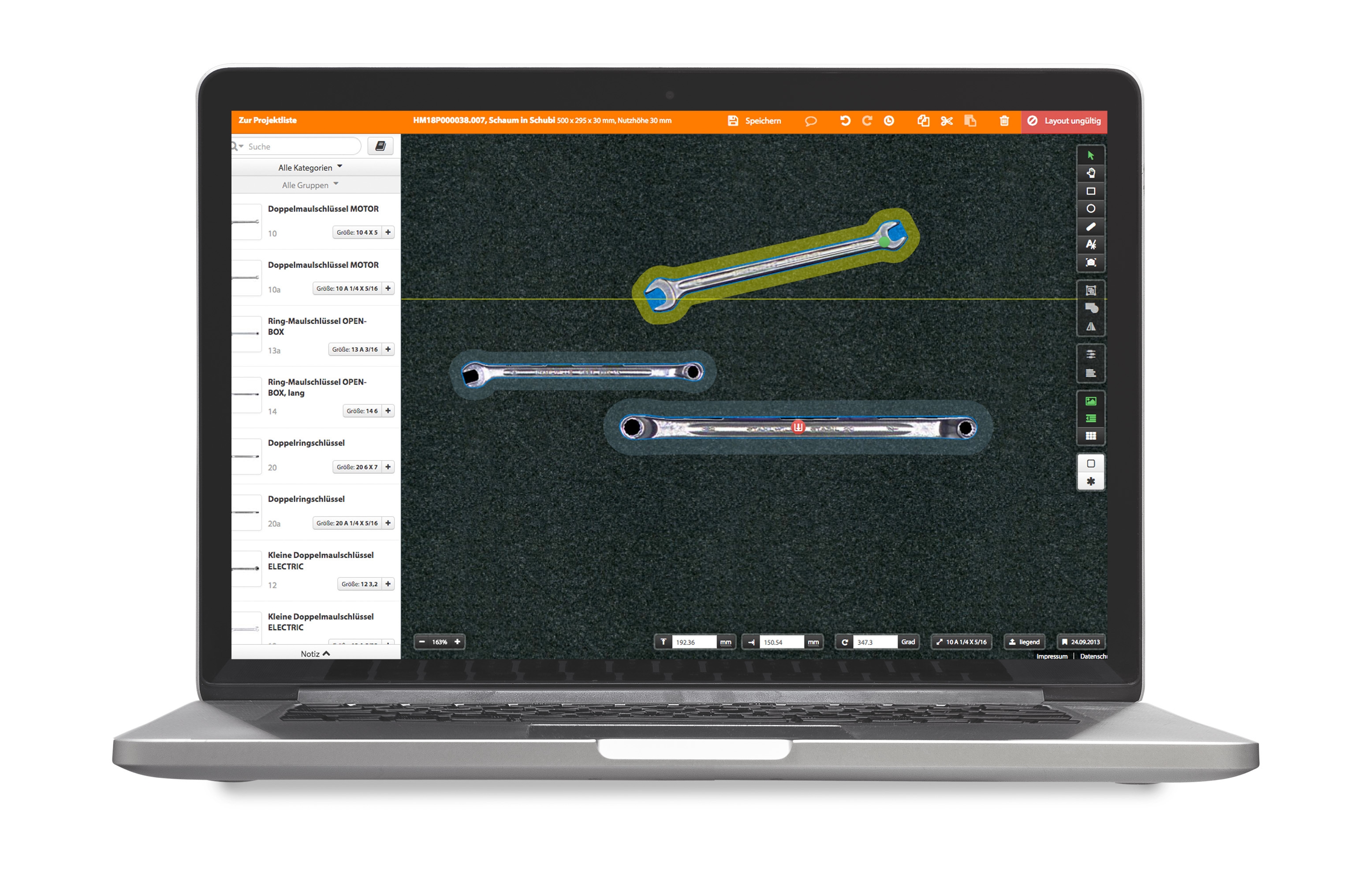 In eForm, users have access to thousands of tool contours, which they can arrange on a virtual foam using drag & drop.